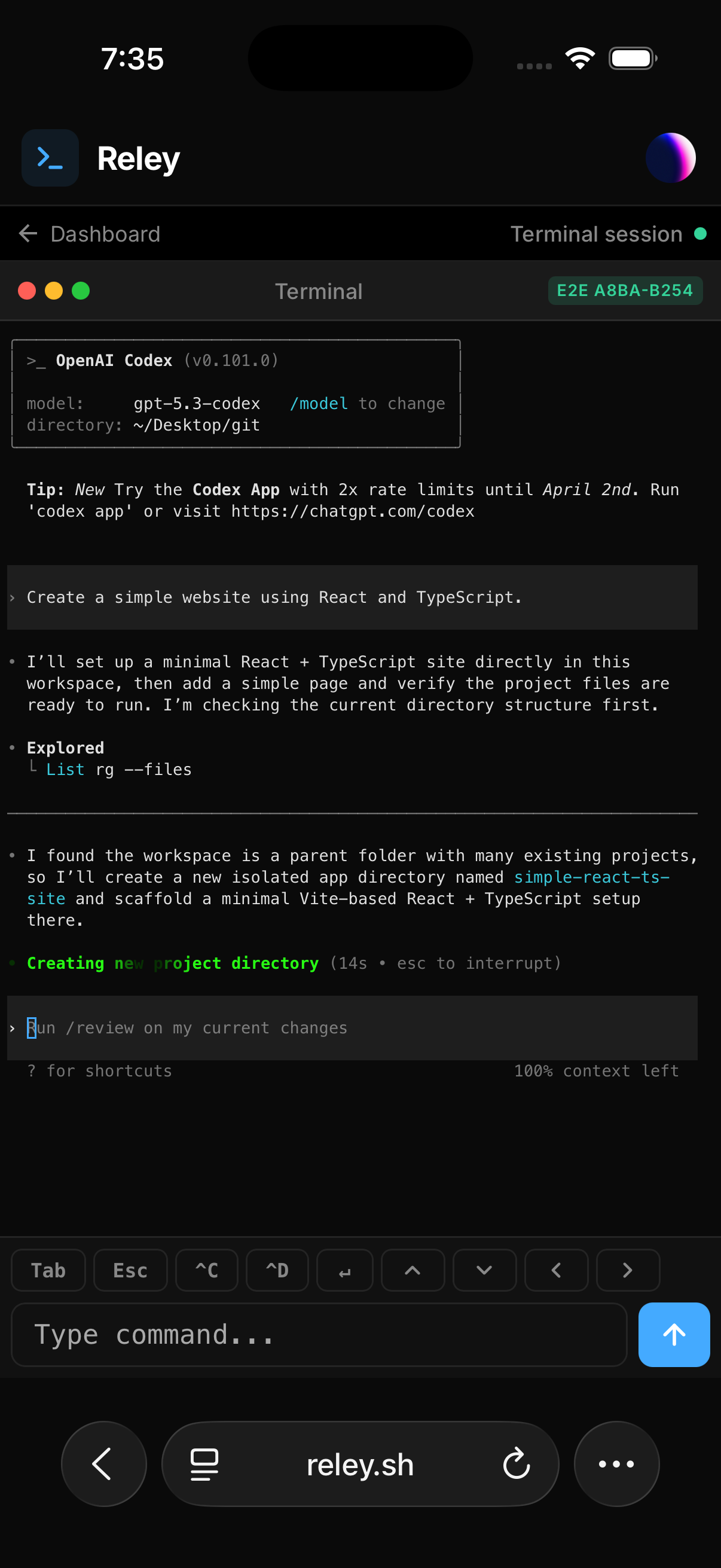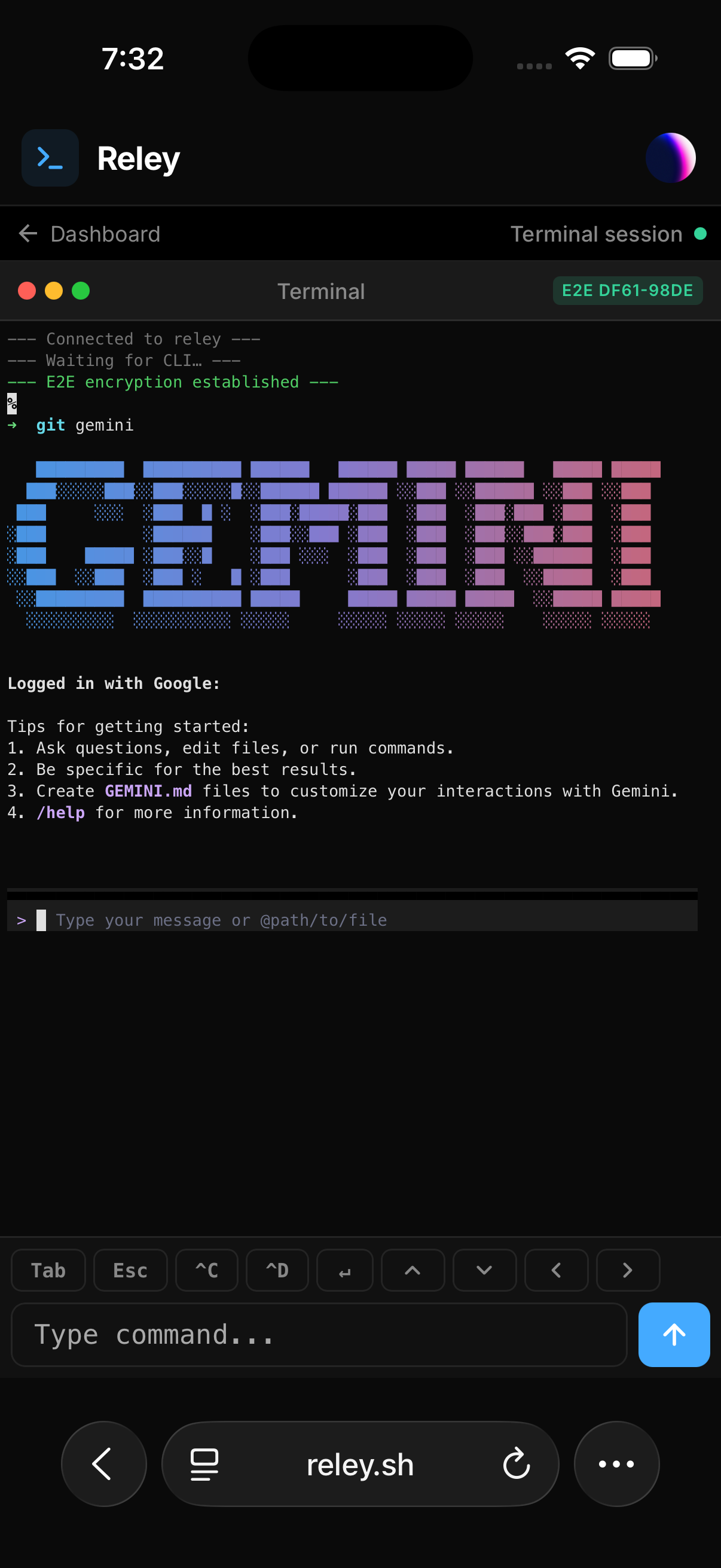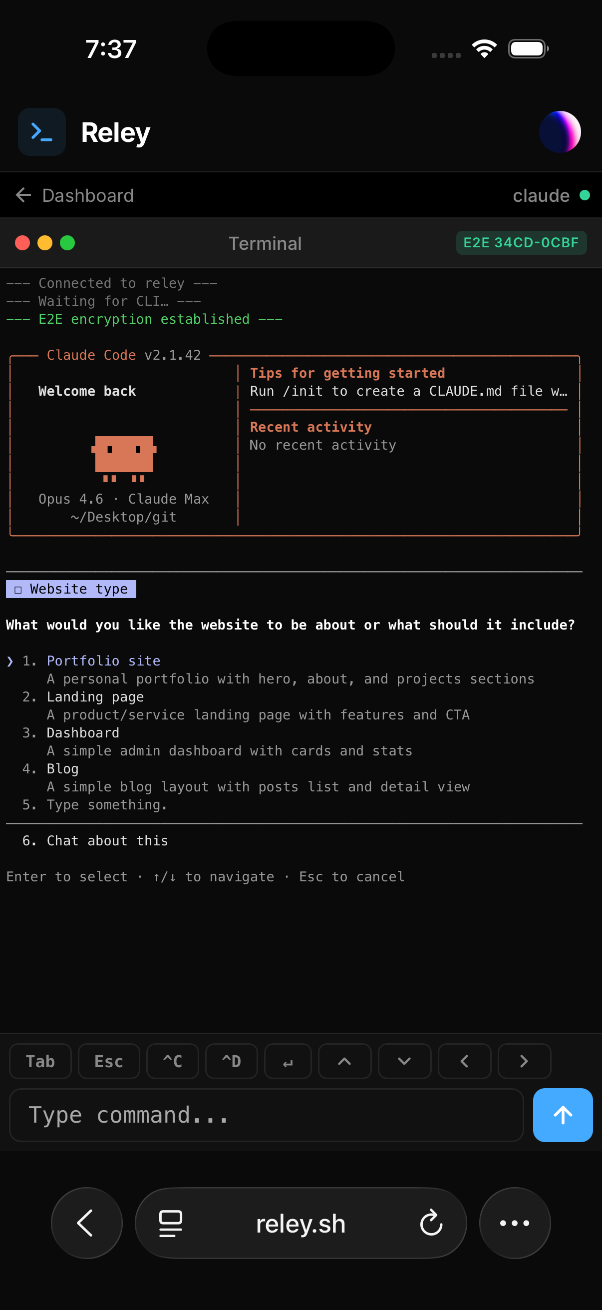 Reley's server is a blind relay. It forwards encrypted binary blobs without the ability to read, store, or analyze your terminal data.